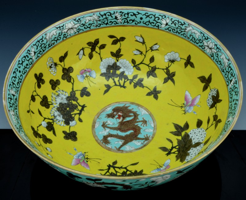 LARGE C1880 CHINESE TURQUOISE ENAMEL DRAGON PUNCH BOWL