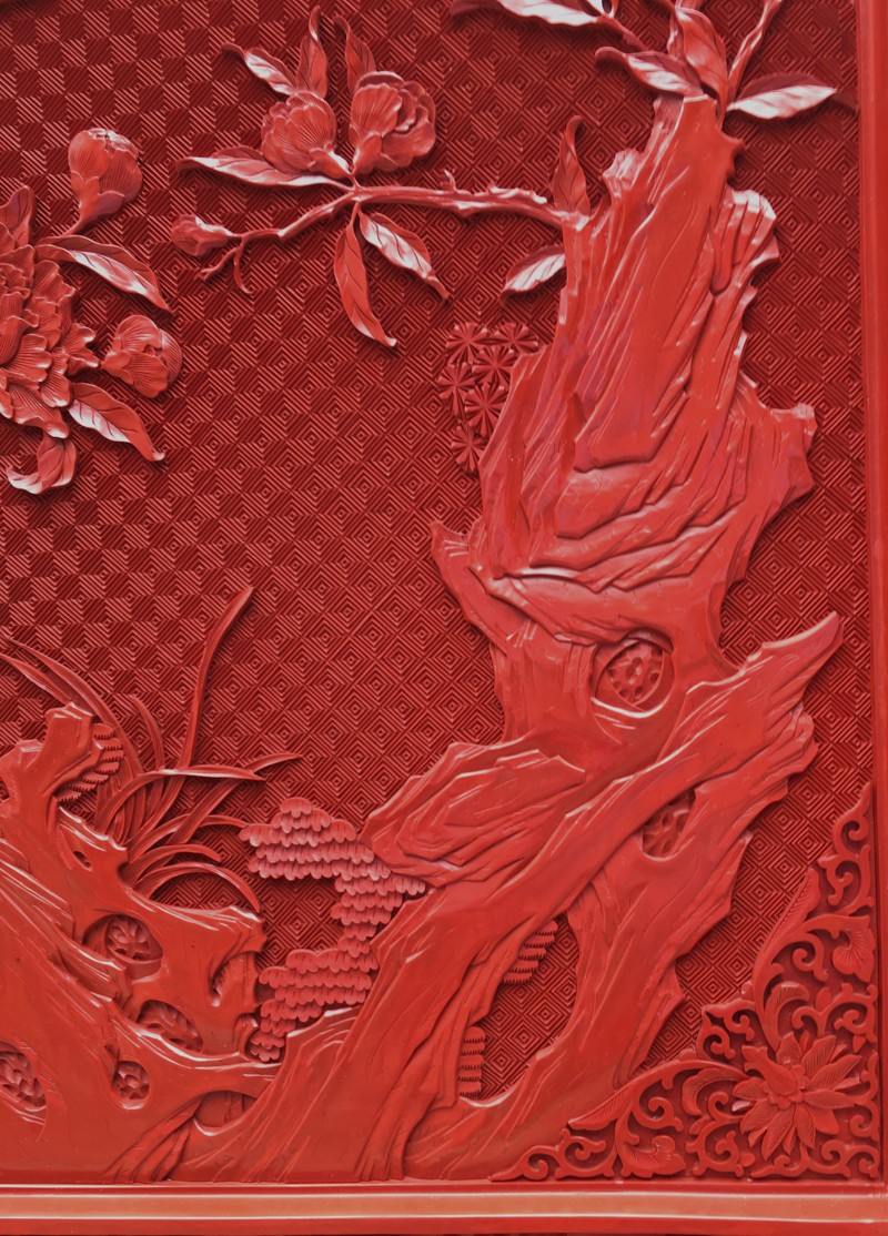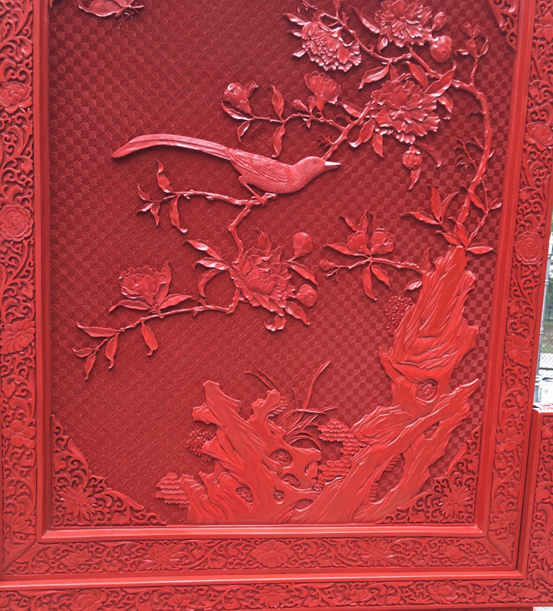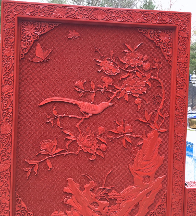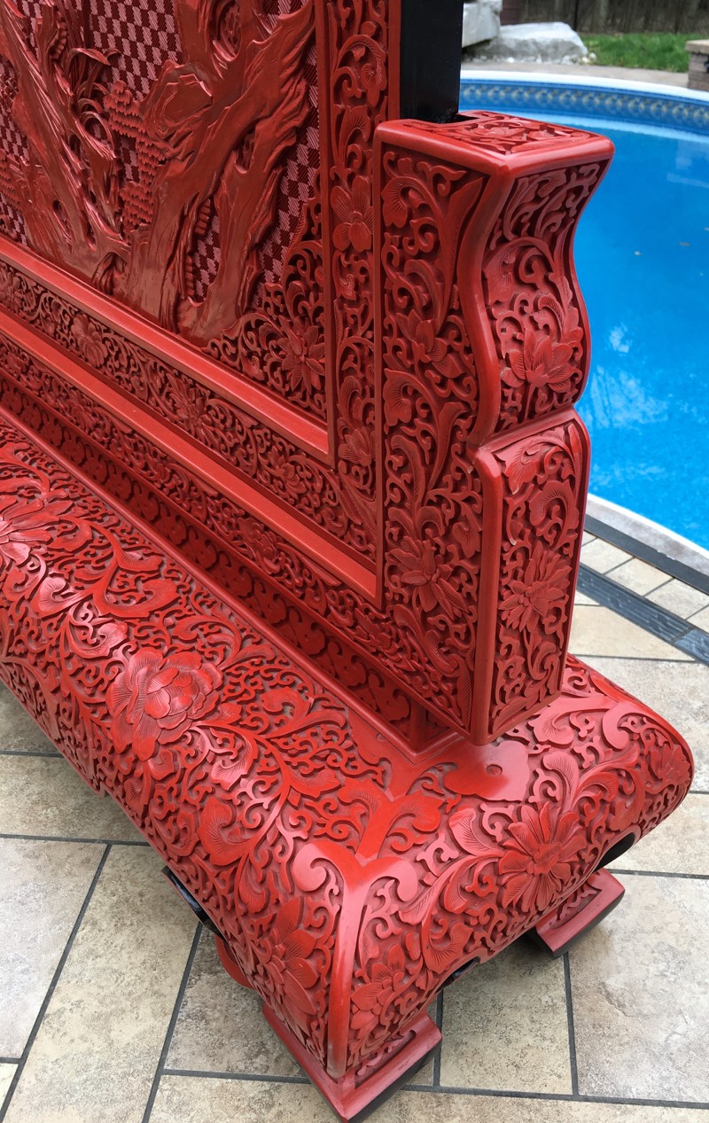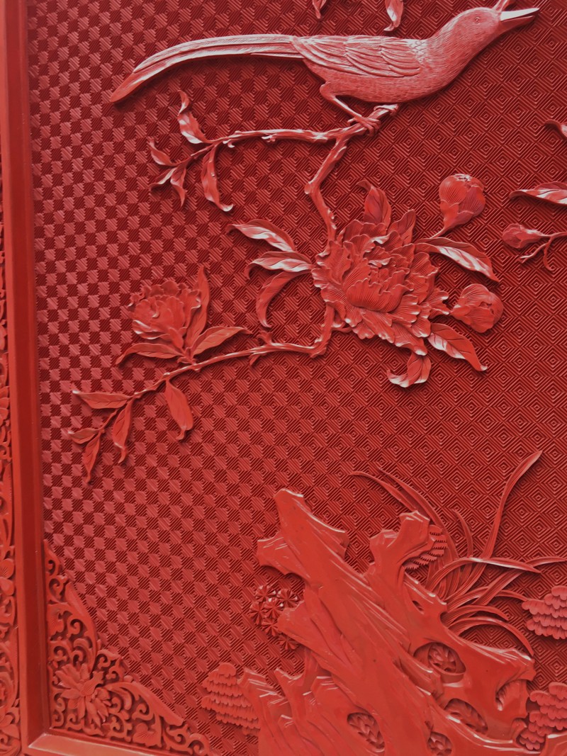 EXCEPTIONAL LARGE CHINESE CINNABAR LACQUER BIRD SCENIC FLOOR SCREEN