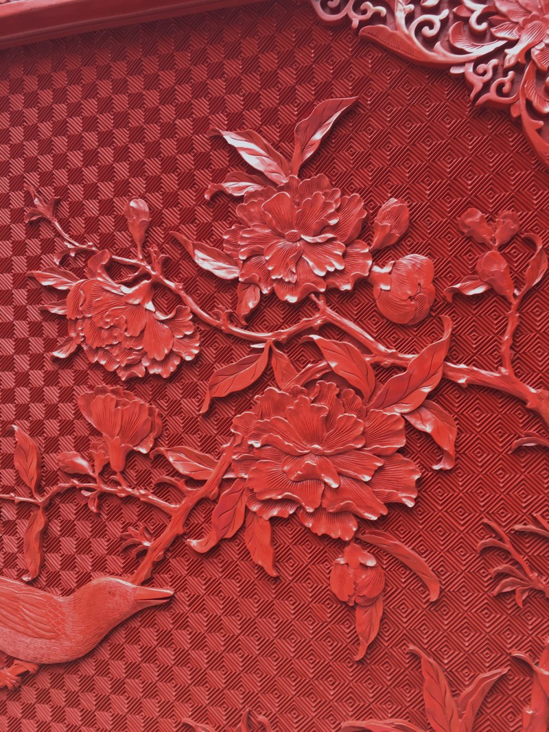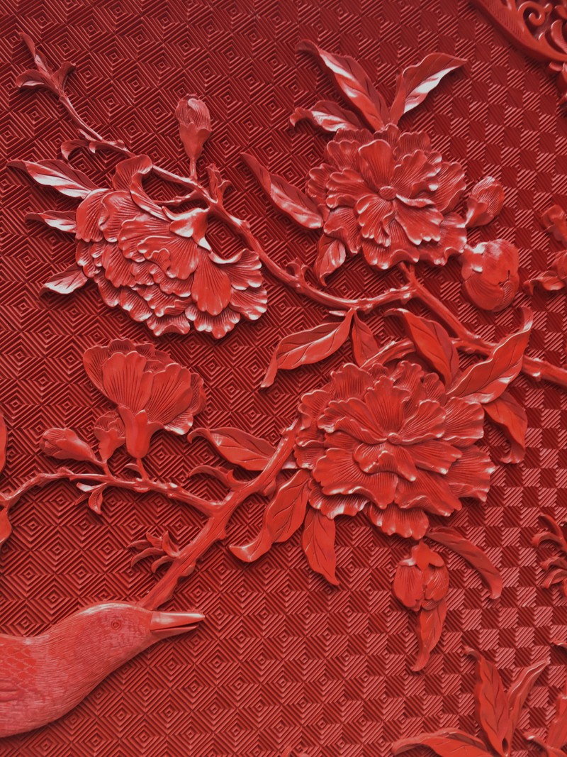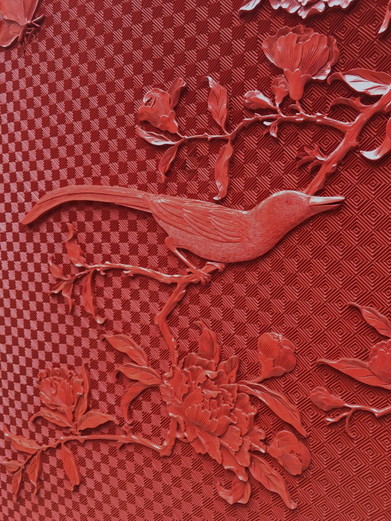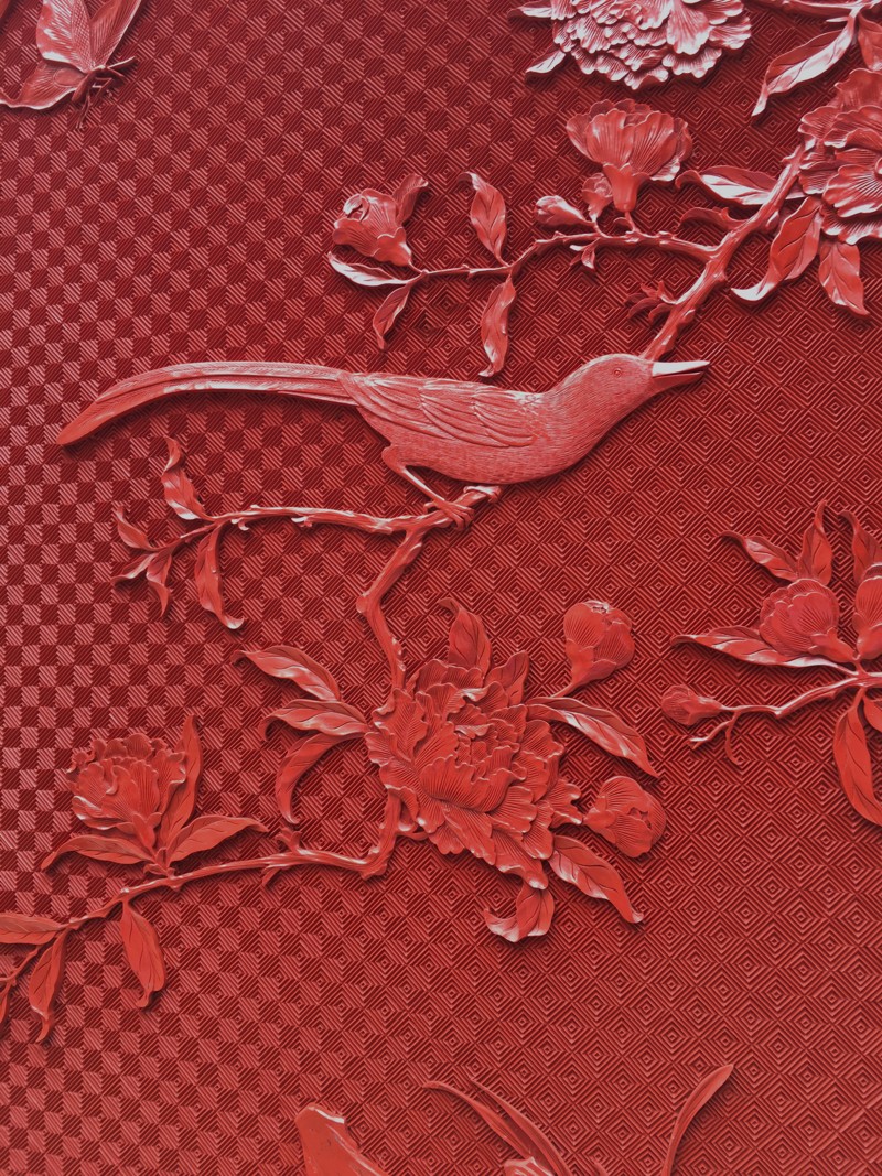 EXCEPTIONAL LARGE CHINESE CINNABAR LACQUER BIRD SCENIC FLOOR SCREEN