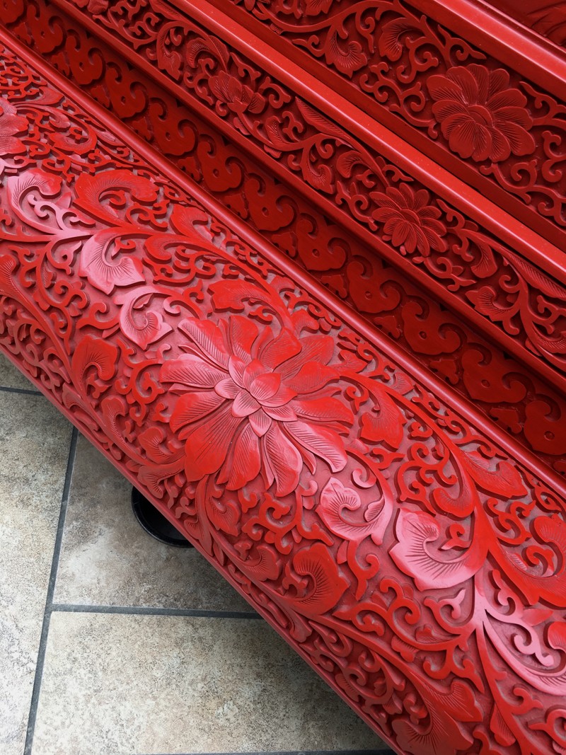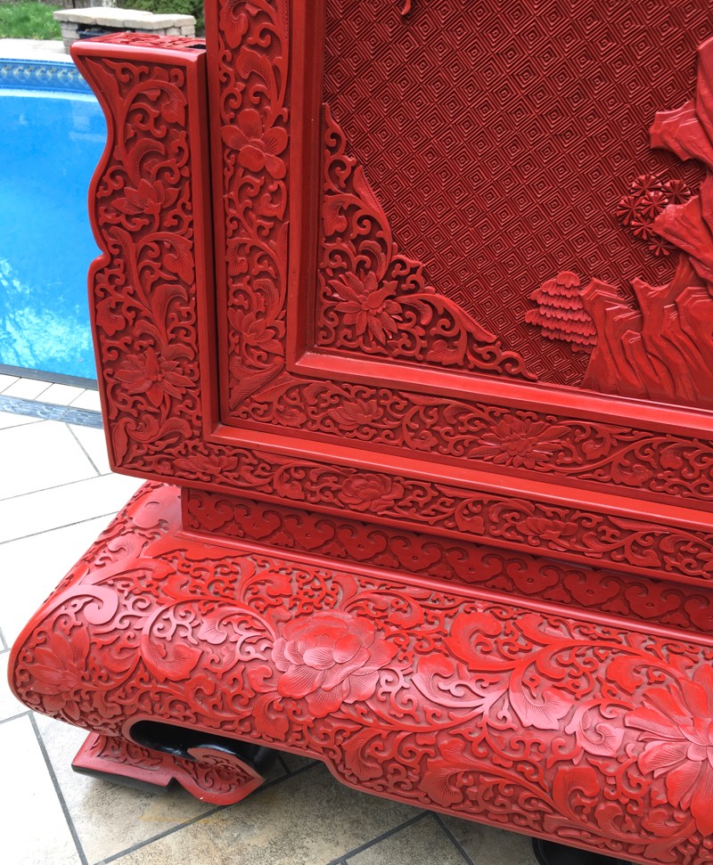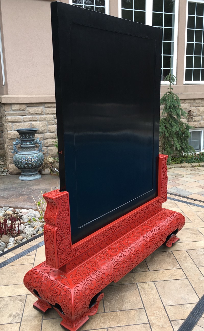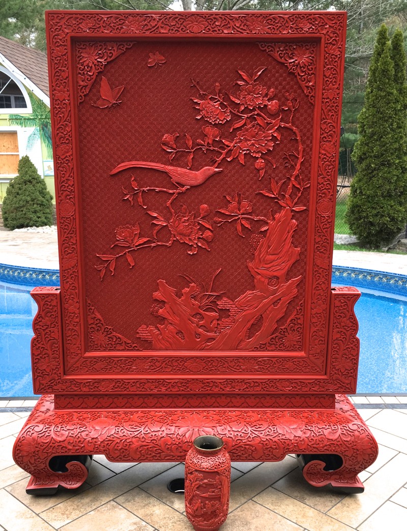 Size: The floor screen is an impressive large example that is an amazing piece to display with the plaque itself measuring 31 1/2 inches tall, by 24 inches wide. The plaque with stand measures 42 1/2 inches tall, by 32 inches long, and 10 inches wide at the base. This is the type of example that can make a good cinnabar collection great. The screen can be both displayed on the floor and also looks amazing on an alter or long side table as the estate had it displayed. I have taken one of the last pictures with a 10-inch cinnabar vase to show the screen's impressive size in comparison.